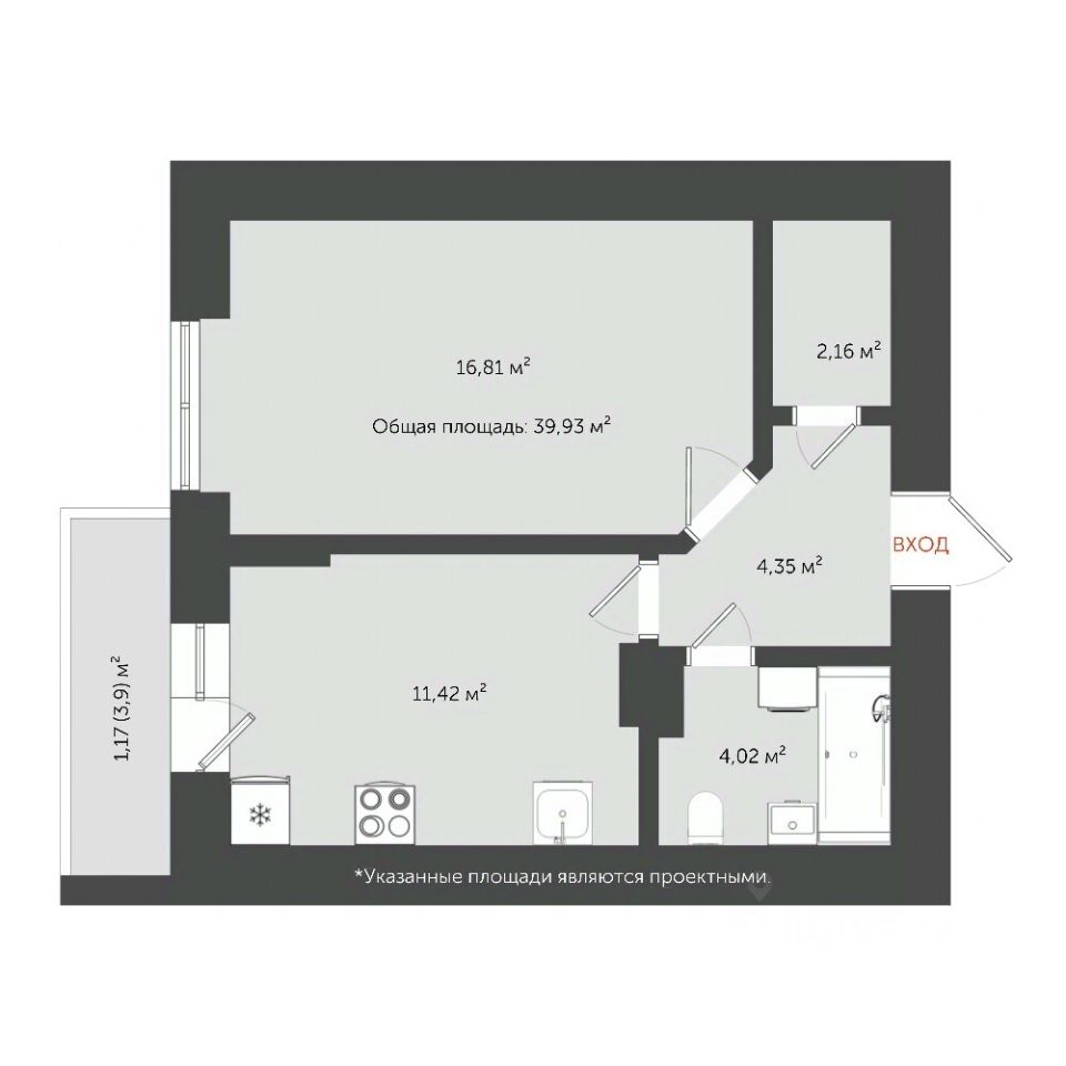 Общая площадь42,9 м²