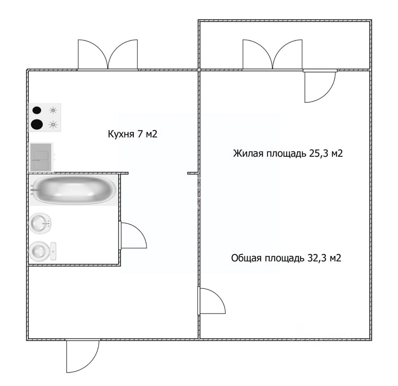Общая площадь в 32 м грамотно распределена: просторная жилая зона в 18 м, уютная кухня в 7 м.