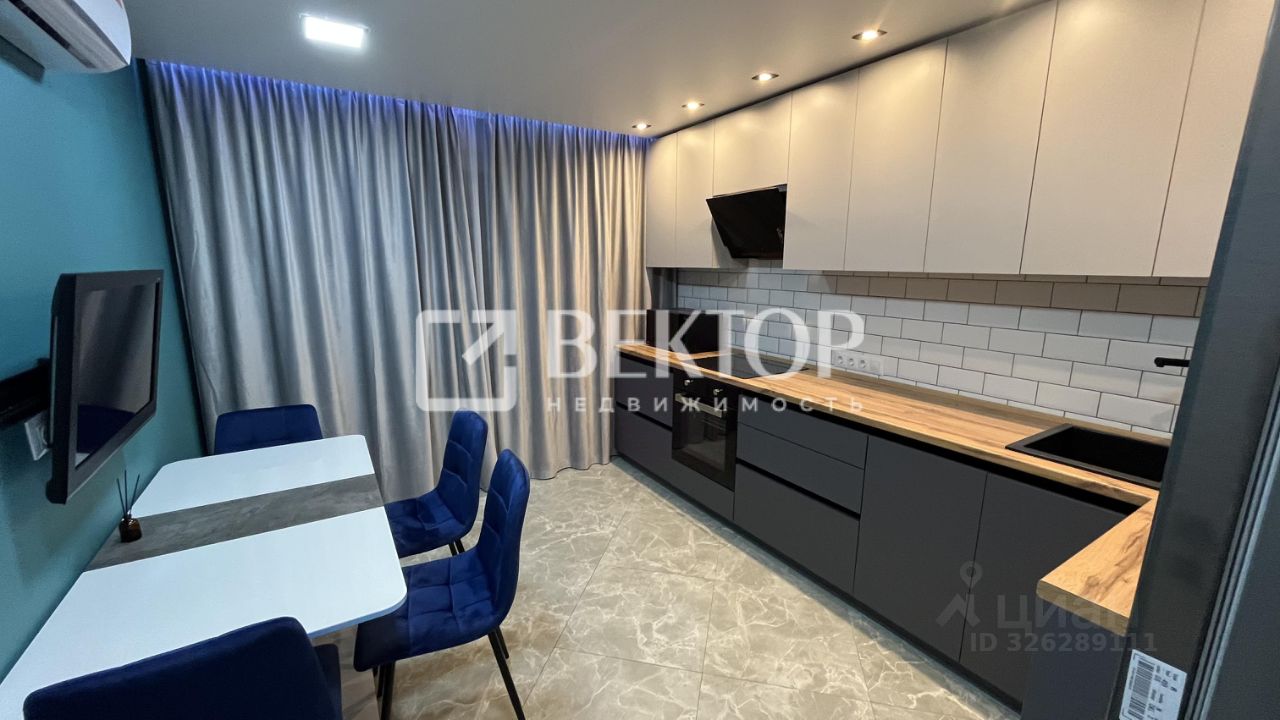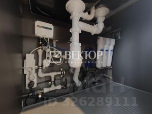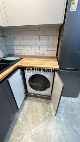 Кухня порадует встроенным гарнитуром: низ выполнен из тёмно-серого матового пластика, верх - из светло-серого матового, профиль "Гола". Установлен трёхступенчатый фильтр питьевой воды, каменная мойка и сантехника. Встроенная бытовая техника включает индукционную варочную панель, духовой шкаф, посудомойку, вытяжку ("Krona", Турция), холодильник, стирально-сушильную машину Indesit, микроволновку и TV LG с классом энергосбережения ААА - всё новое. Материал штор и стульев - велюр. Предусмотрено четыре зоны