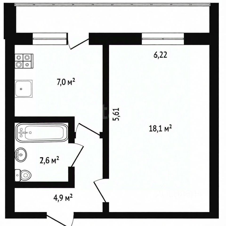 Планировка: просторная комната, кухня с выходом на широкую застеклённую лоджию длиной целых 6 метров.
