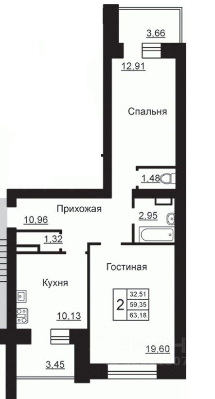 Планировка: две просторные комнаты (19,6 м² + 13 м² из спальни выход на застекленную лоджию площадью 3,66 м2) и кухня площадью 10,13 м² с удобным выходом на застеклённую лоджию 3,45 м²