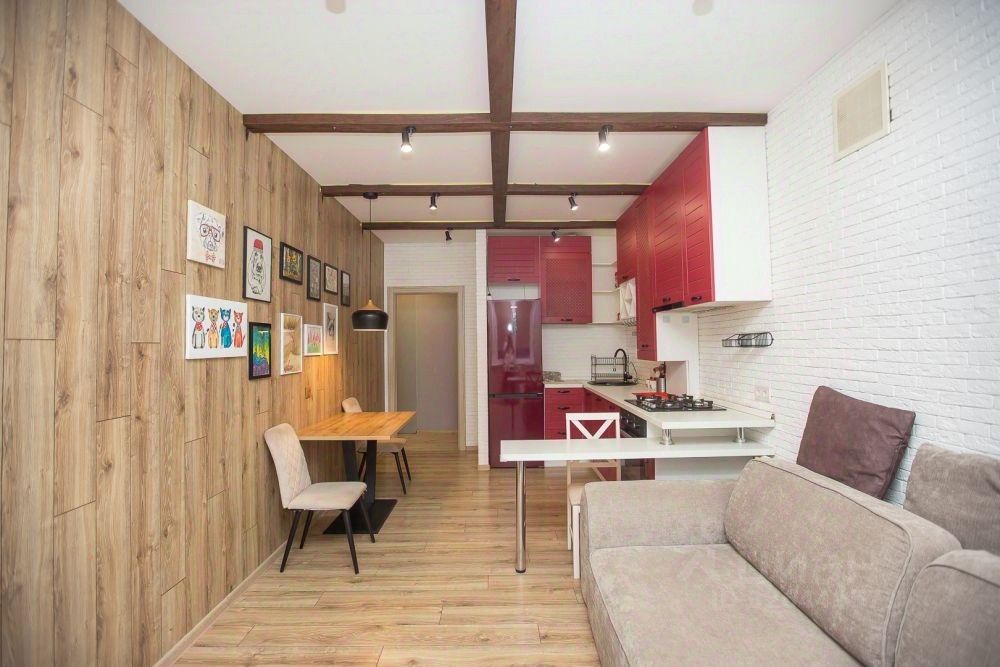 •Сердце дома кухня-гостиная 18 м²: Прямоугольная форма позволяет легко зонировать пространство для приготовления пищи, уютных семейных ужинов и отдыха в гостиной. Здесь найдется место для дополнительного спального места, что очень удобно для гостей.