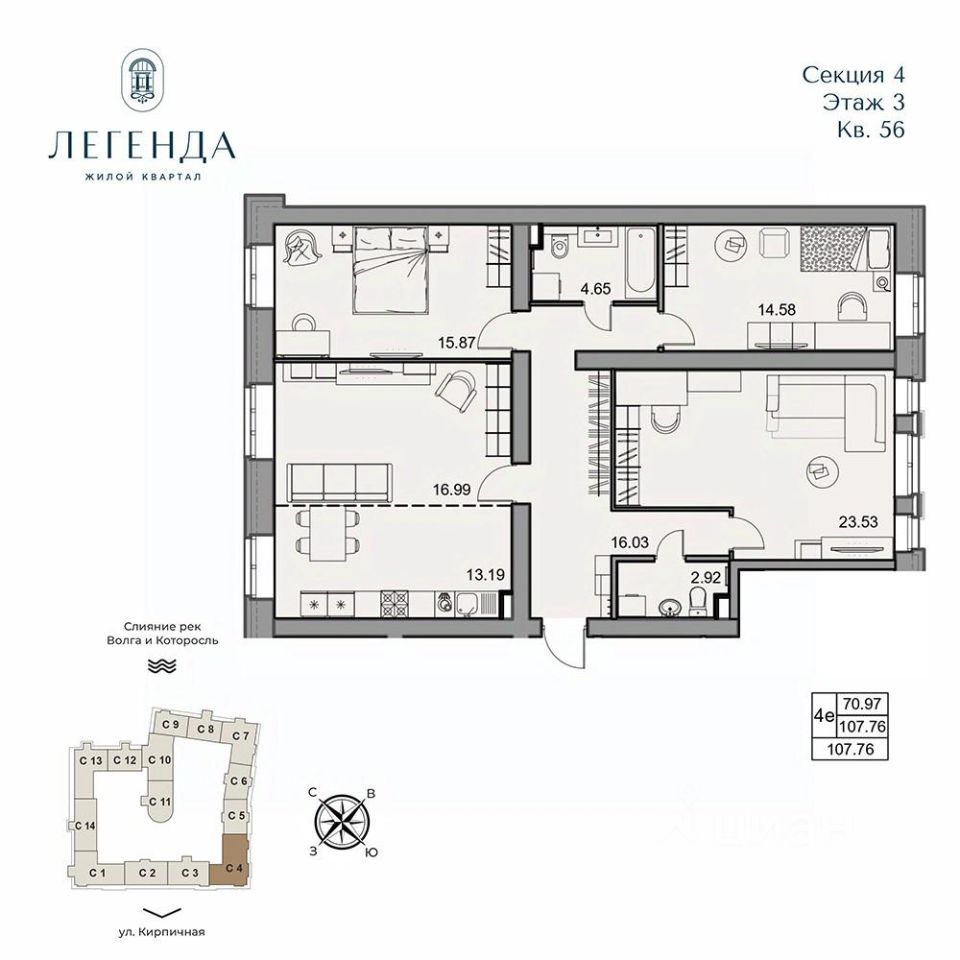 Продаётся 4-комнатная квартира в строящемся доме (Корпус 1), срок сдачи: IV-кв. 2026, общей площадью 107.76 кв.м., на 3 этаже. Новый жилой комплекс на ул. Кирпичная от застройщика "Наследие".