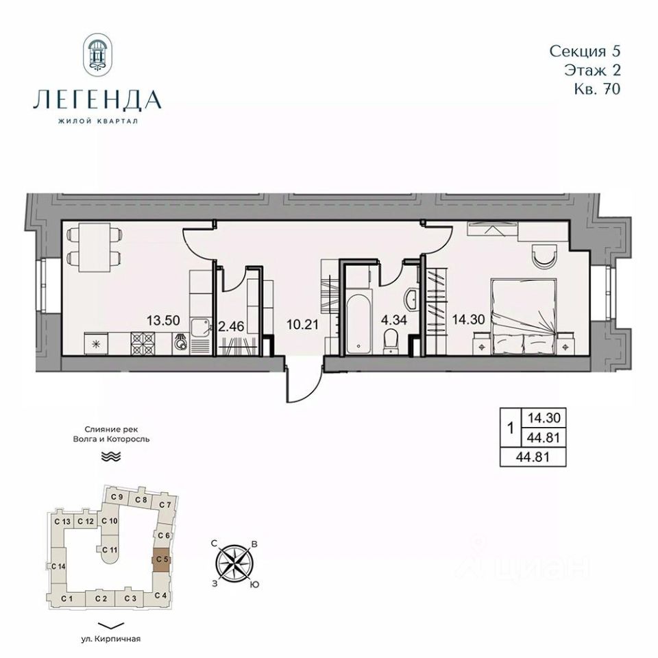 Продаётся 1-комнатная квартира в строящемся доме (Корпус 1), срок сдачи: IV-кв. 2026, общей площадью 44.81 кв.м., на 2 этаже. Новый жилой комплекс на ул. Кирпичная от застройщика "Наследие".