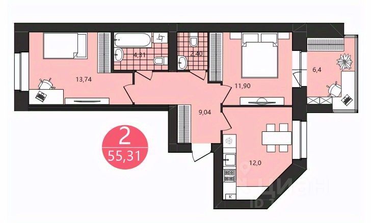 Общая площадь55,31 м²