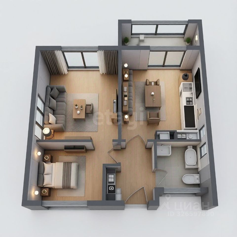 * Видовое преимущество: Панорамный вид на Волгу из основной комнаты, объединённой с лоджией. Пространство наполнено светом и визуально расширено.