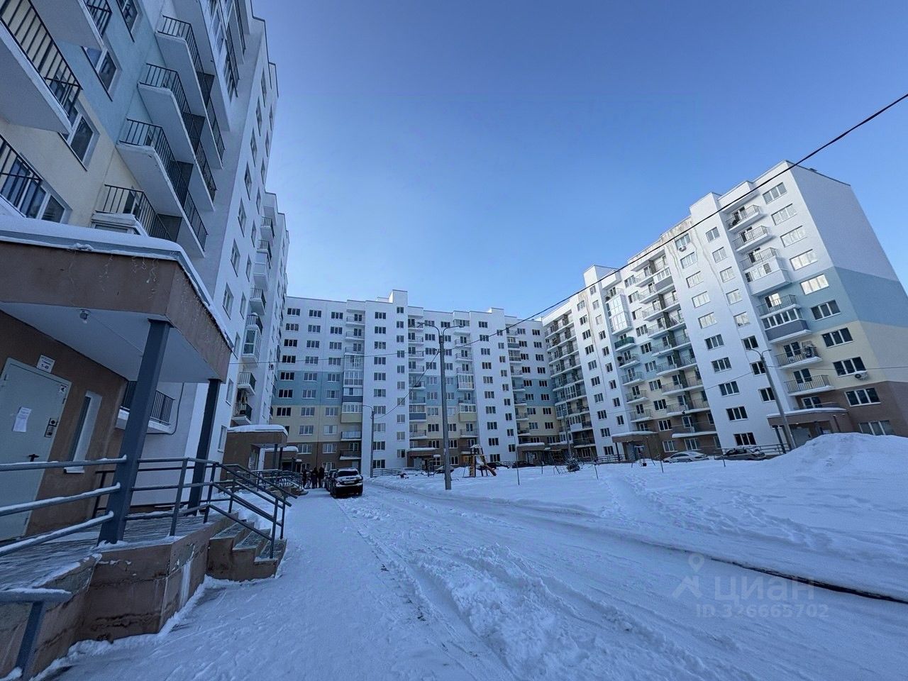 Благоустроенная дворовая территория: удобные пешеходные зоны и места отдыха, озеленение, детские площадки.