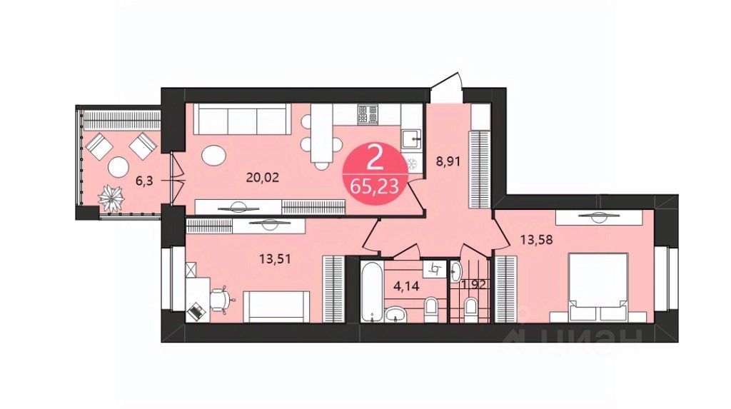 2-комнатная с просторной кухней-гостиной и двумя отдельными спальнями- так называемая ДВУТРЕШКА - квартира с функционалом 3 комнатной.