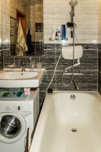 Санузел совмещенный, в кафеле, новая сантехника, поменяны все трубы, установлены счетчики и теплый пол.