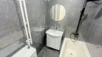 В жилых комнатах и на кухне - обои и ламинат, в санузле - новая плитка и сантехника. Во всей квартире - натяжные потолки.