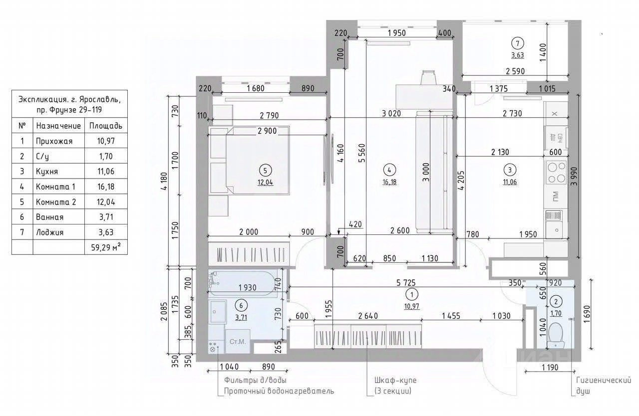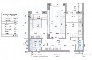 - общая площадь квартиры 55,8 кв.м. (по документам), актуальный обмерочный план прикрепляю (по замерам реальная площадь 59,29 с учетом лоджии 3,63 кв.м).