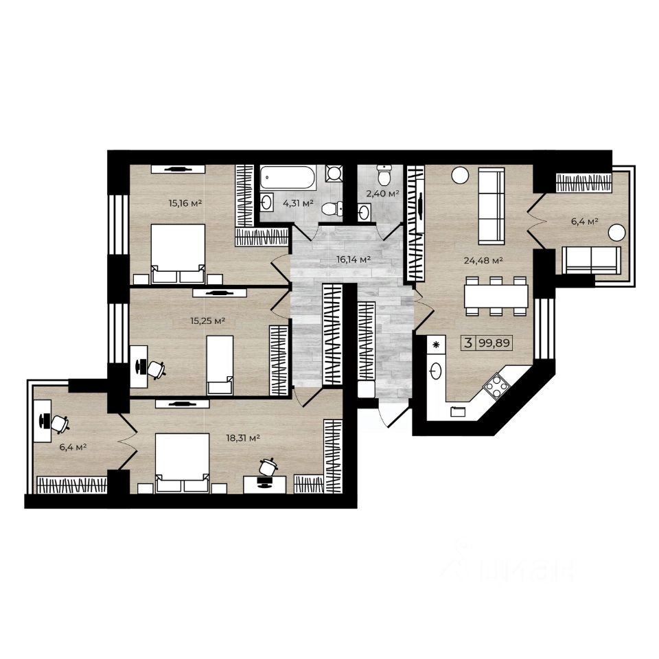 Преимущества квартиры: кухня-гостиная 24,48 кв. м, двумя санузлами и двумя шикарными просторными балконами