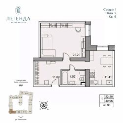 Продается светлая 1-комнатная квартира 49.96 кв.м. Этаж 2, подъезд 1.