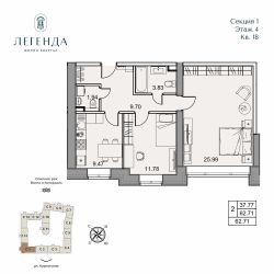 Продается светлая 2-комнатная квартира 62.71 кв.м. Этаж 4, подъезд 1.
