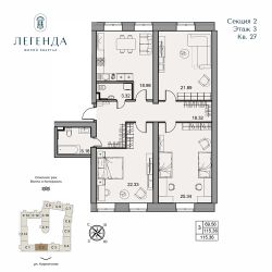 Продается светлая 3-комнатная квартира 115.36 кв.м. Этаж 3, подъезд 2.
