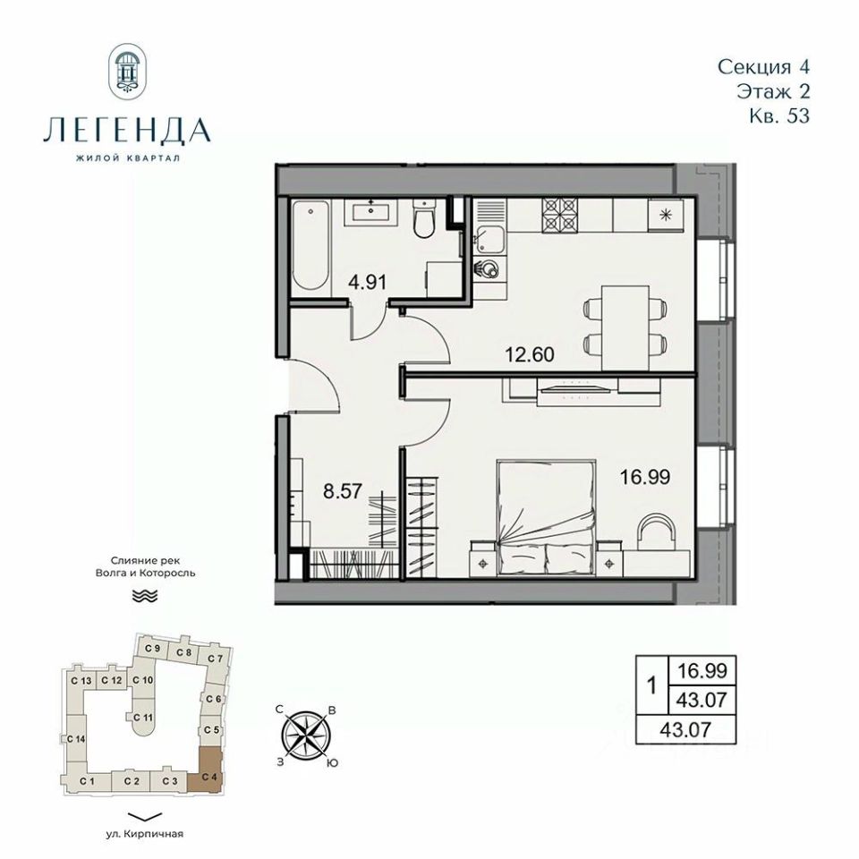 Продается светлая 1-комнатная квартира 43.07 кв.м. Этаж 2, подъезд 4.