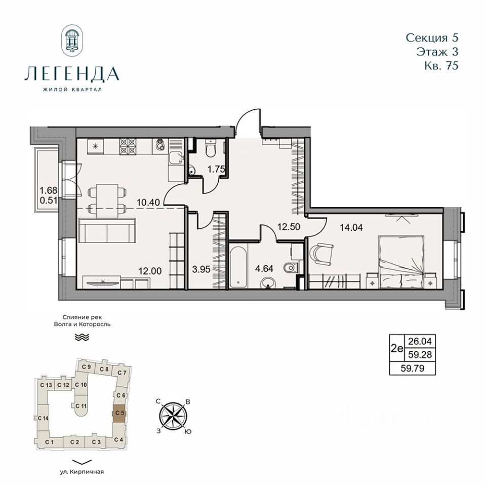 Продается светлая 2-комнатная квартира 59.79 кв.м. Этаж 3, подъезд 5.