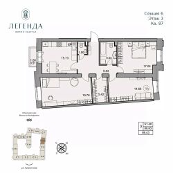 Продается светлая 3-комнатная квартира 89.43 кв.м. Этаж 3, подъезд 6.