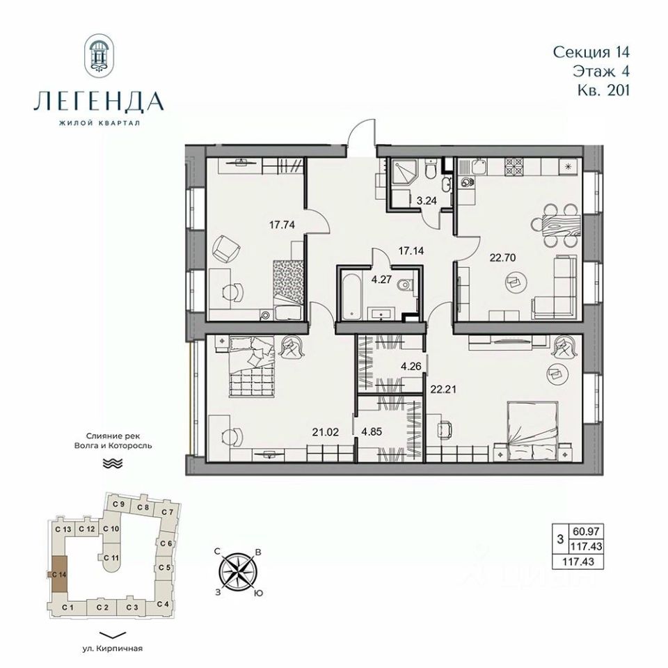 Продается светлая 3-комнатная квартира 117.43 кв.м. Этаж 4, подъезд 14.