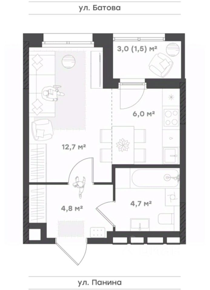 Студия- 1 комната и просторная кухня-гостиная с выходом на лоджию