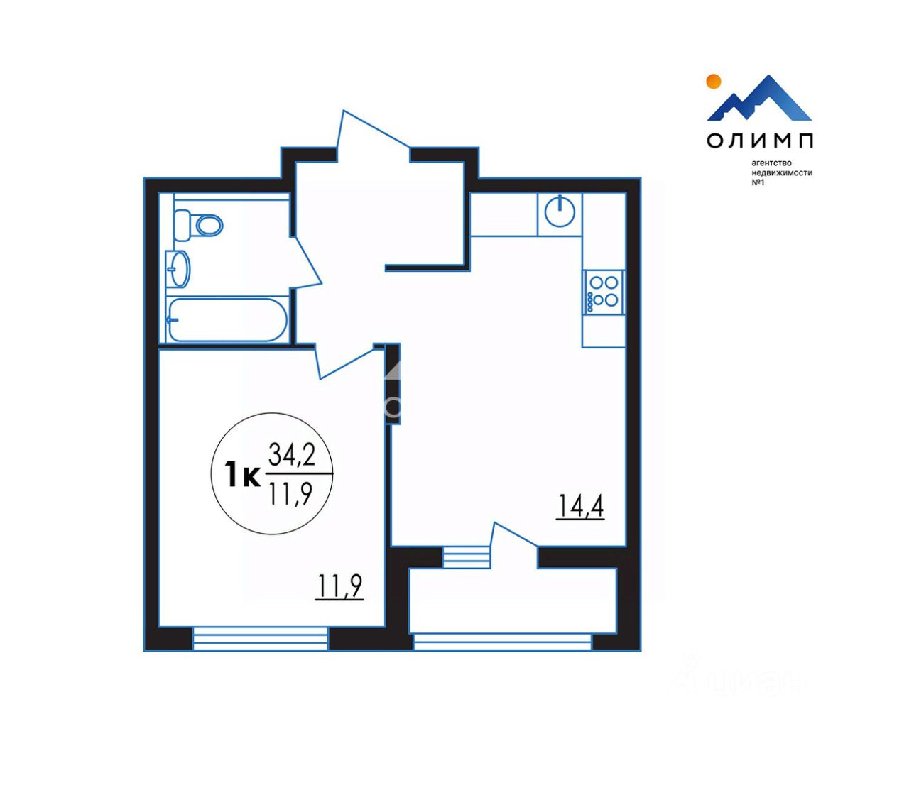 - площадь кухни 14,4м2, комната - 11,9 м2;