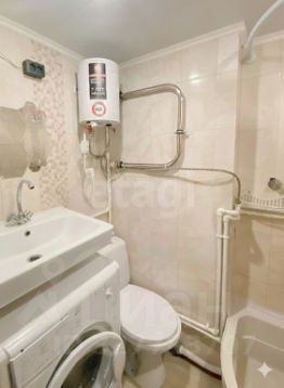 Душевая кабина и туалет совмещенные, в кафеле. Остается стиральная машина и водонагреватель;