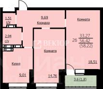Общая площадь жилья составляет 58,22 м, что включает в себя жилую зону 33,27 м и кухню площадью 9,01 м.