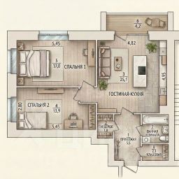 Продуманная планировка. Раздельные комнаты (17 и 14 м2) дают личное пространство каждому члену семьи. Большая кухнягостиная 25,1 м2 станет любимым местом для совместных ужинов и приема гостей. Лоджия с панорамным остеклением — зона отдыха с видом на двор.