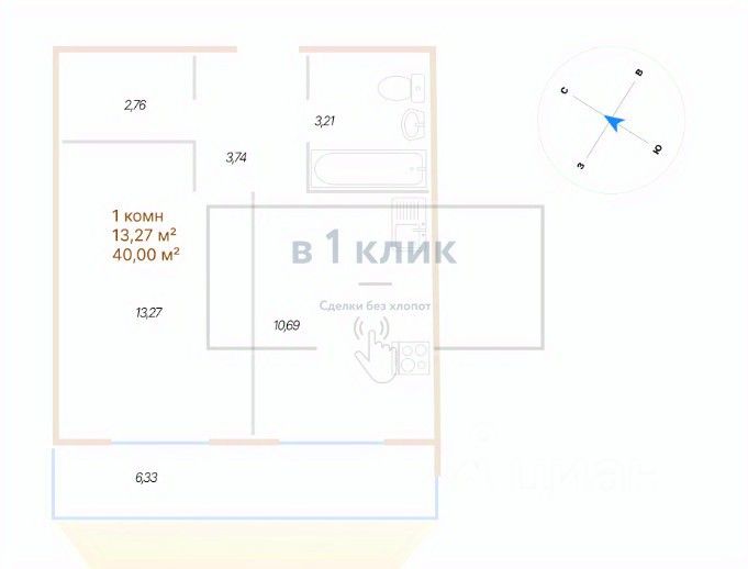 Квартира свободной планировки, 40 м²