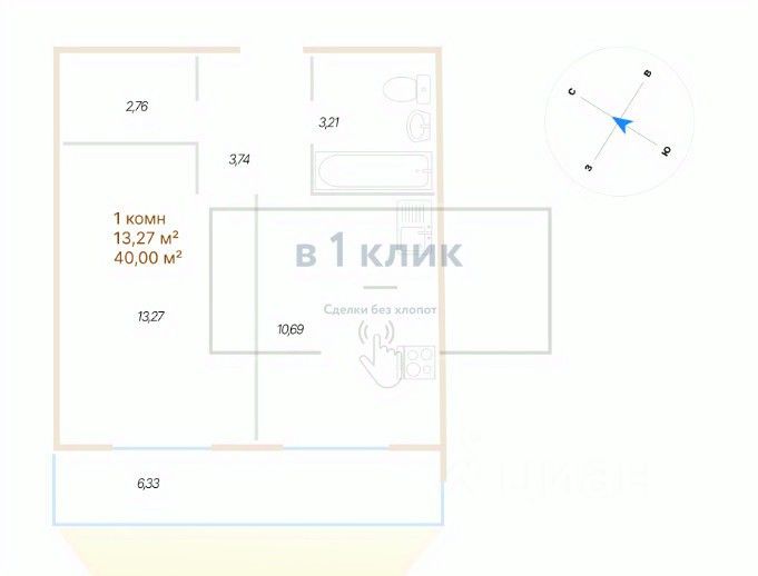 Квартира свободной планировки, 40 м²