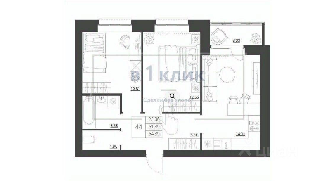 Общая площадь 54,4
