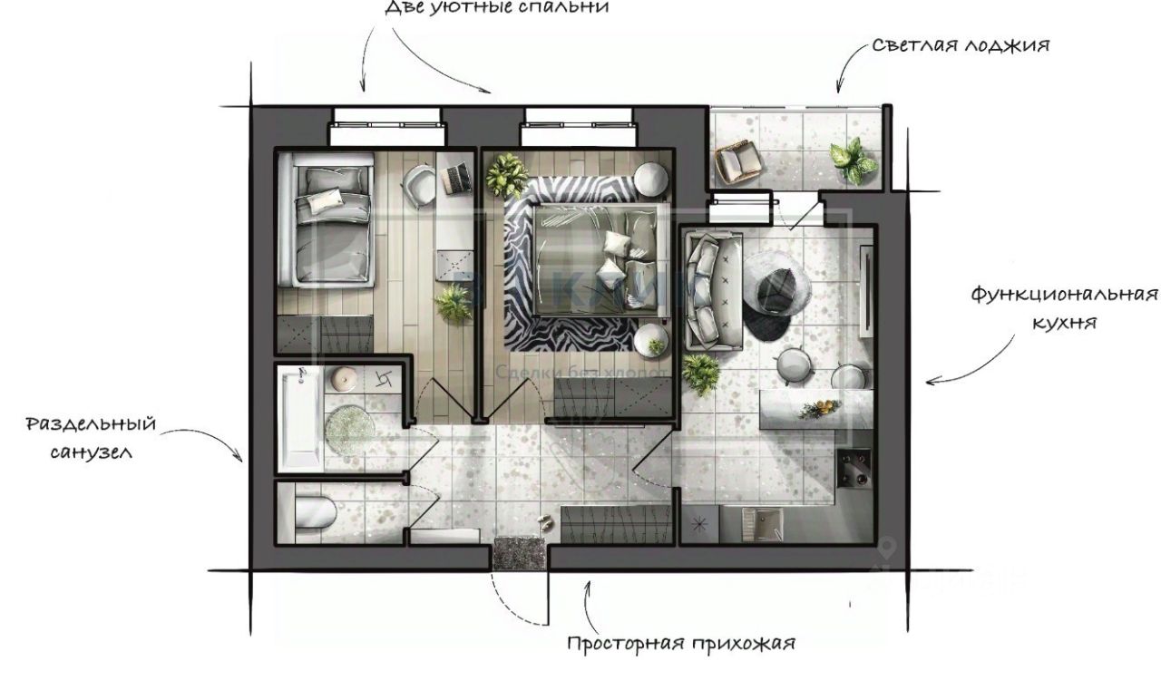 Квартира с предчистовой отделкой - стяжки полов, подготовка стен, алюминиевое остекление балконов и лоджий, высокие потолки.