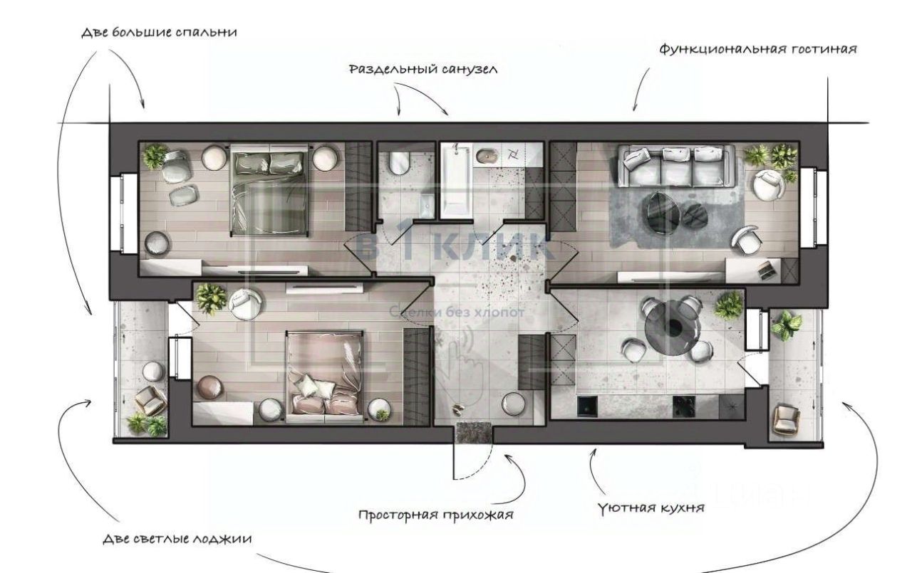 Квартира с предчистовой отделкой - стяжки полов, подготовка стен, алюминиевое остекление балконов и лоджий, высокие потолки.