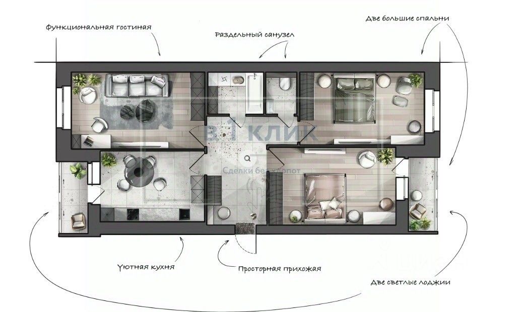 Квартира с предчистовой отделкой - стяжки полов, подготовка стен, алюминиевое остекление балконов и лоджий, высокие потолки.
