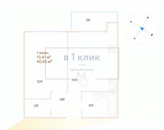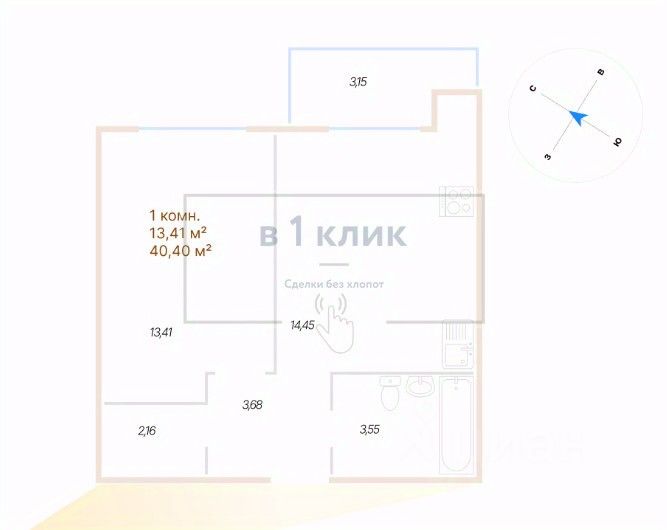 Квартира свободной планировки, 40,4 м²