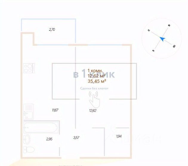 Квартира свободной планировки, 35,45 м²