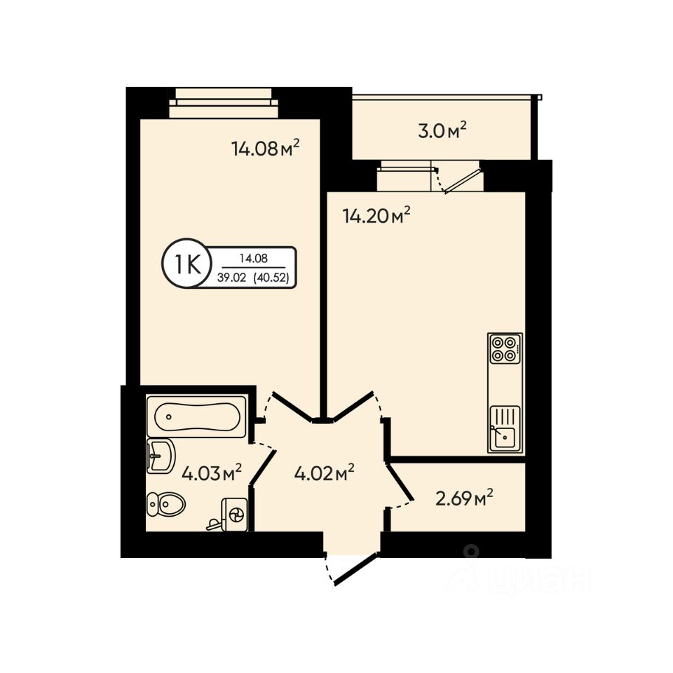1-комн. квартира, 40,52 м²