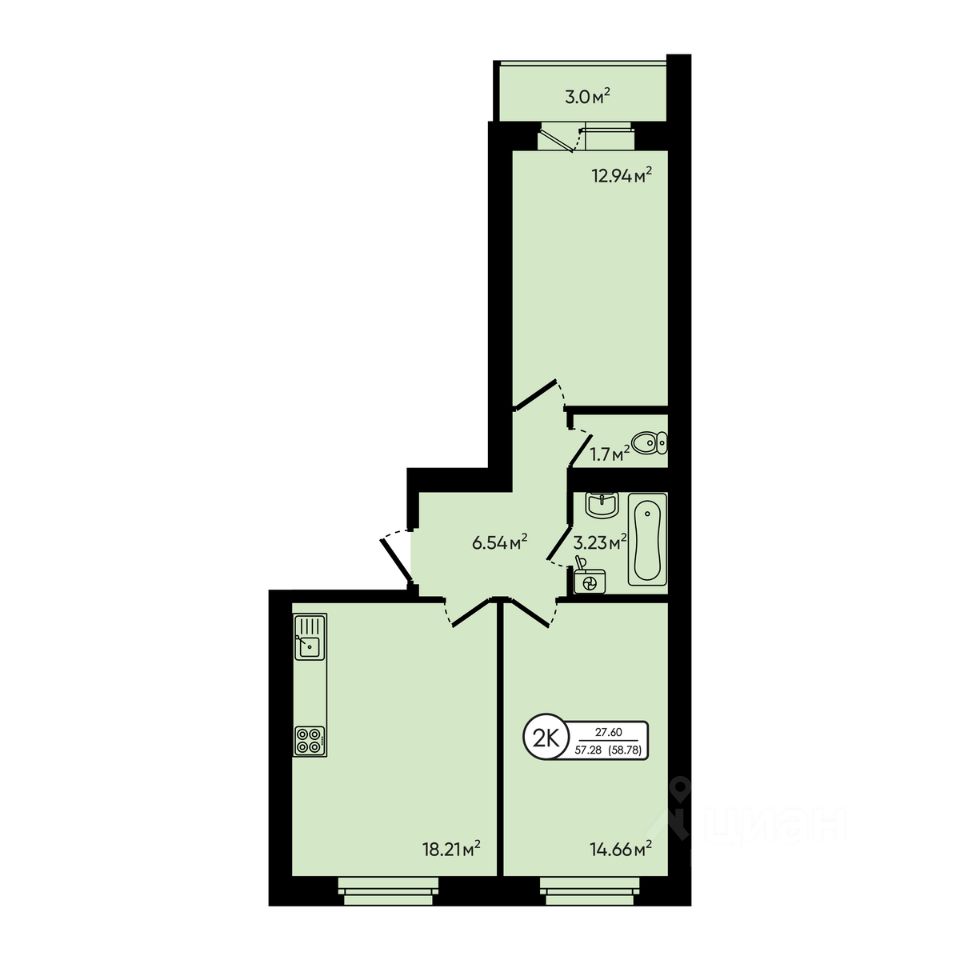 2-комн. квартира, 58,78 м²
