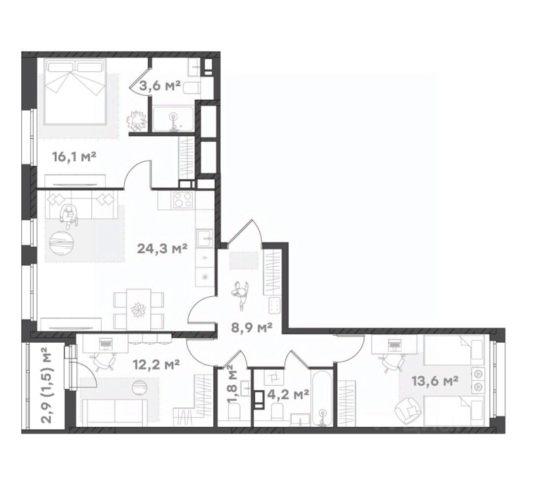 Семейная квартира - 3 комнаты и просторная кухня-гостиная с выходом на лоджию