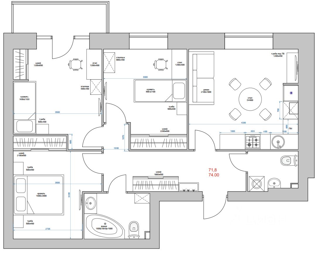 74 м²