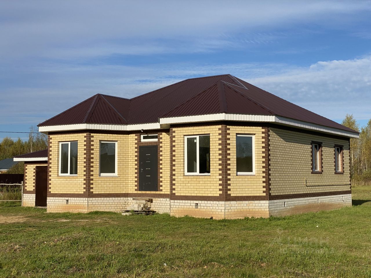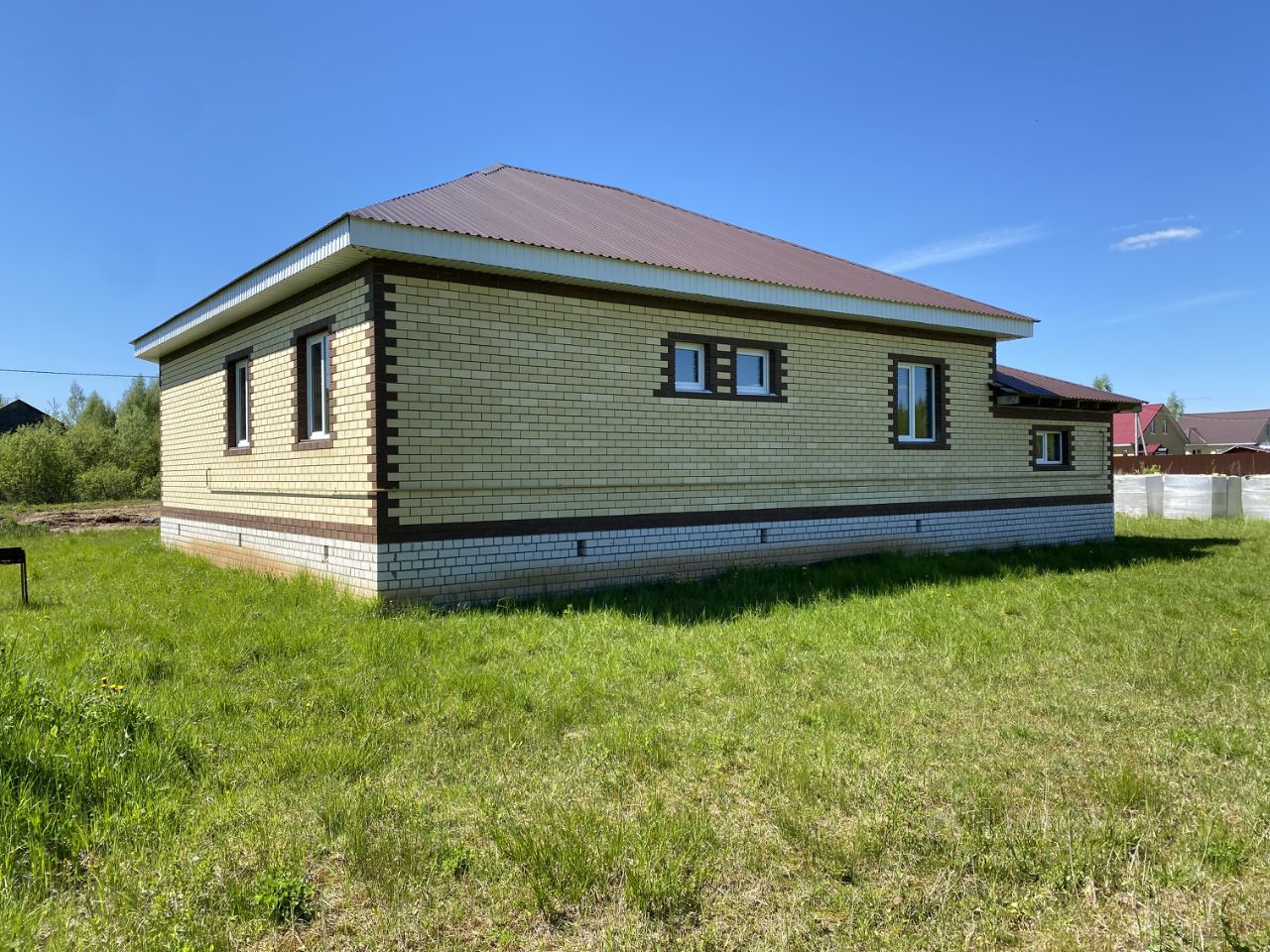 Дом построен из газобетона, обложен кирпичом. Фундамент ленточный, плюс цоколь 1 метр высотой. Подготовлен под финишную отделку. Установлены натяжные потолки. Проведена система "тёплый пол".