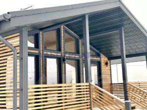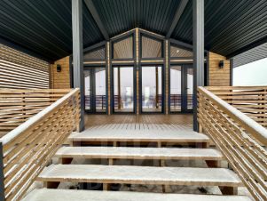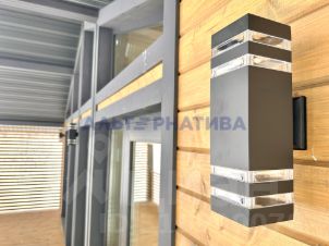 Планировка дома включает в себя: тамбур, 2 спальни, санузел, просторную кухню-гостиную с выходом на веранду. На веранде установлены фонари.