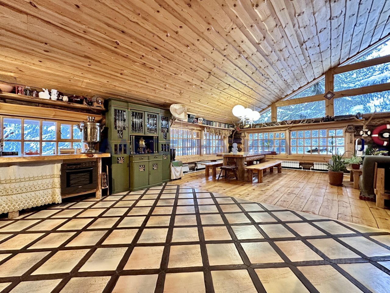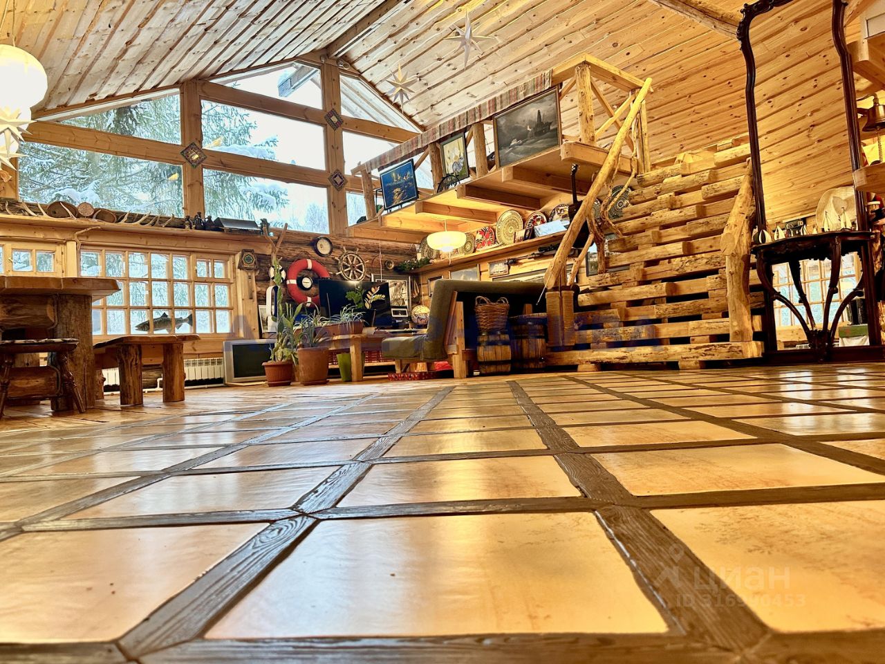 Этот двухэтажный бревенчатый дом был построен в 2016 году и имеет общую площадь 276,8 квадратных метров. Фундамент дома выполнен на сваях. Вдоль всего периметра дома имеется открытая терраса шириной 4 метра. На террасе находится уютная мангальная зона, где можно наслаждаться местной красотой и проводить время на свежем воздухе.