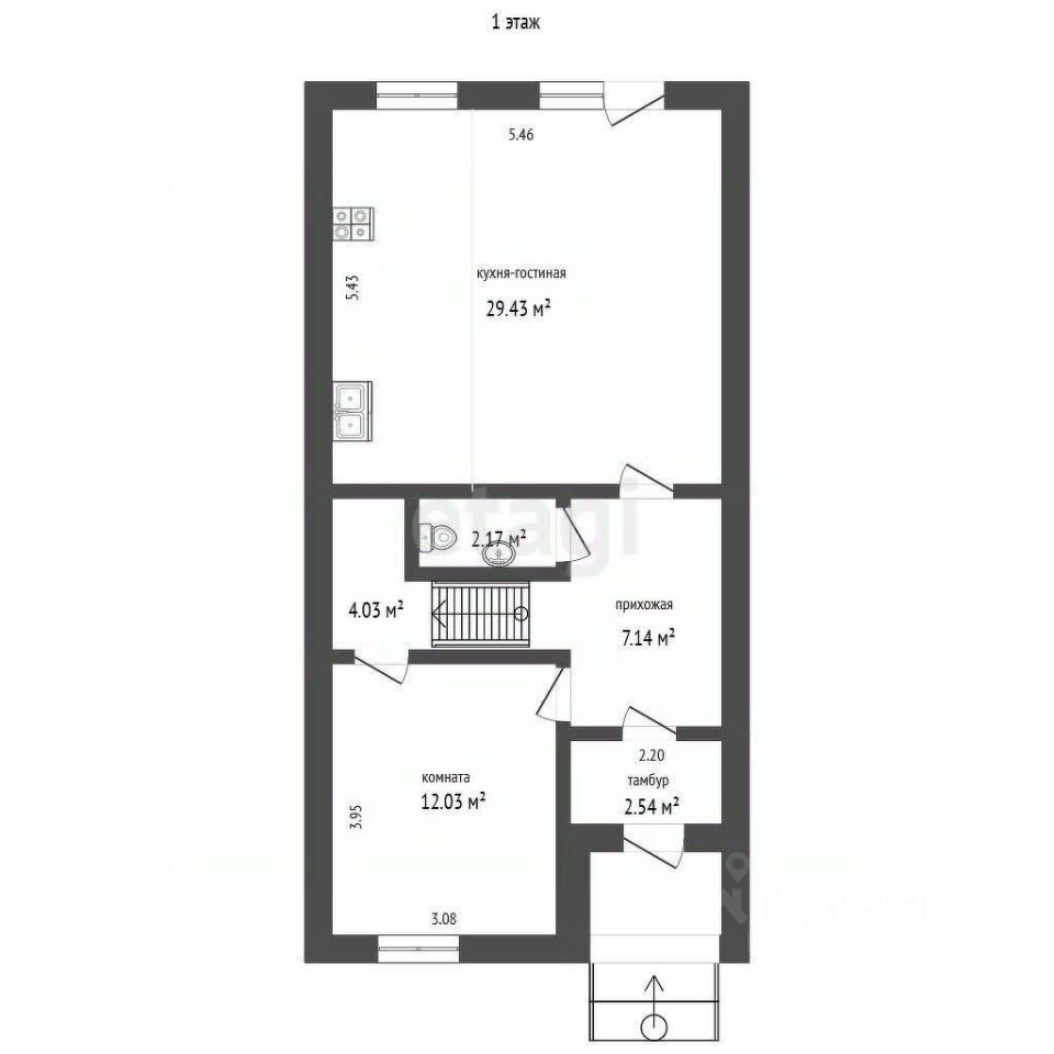 На первом этаже расположена просторная кухня-гостиная 29,4 кв.м и отдельная комната, второй этаж представляет собой свободное пространство 50 кв.м, которое можно адаптировать под спальни, кабинет или зону отдыха. По желанию покупателя собственник выполнит работы по зонированию и внутренней отделке.