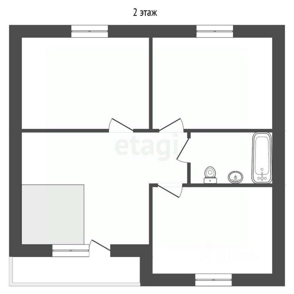 2 этаж: - жилая - 14.1 м2, 12.5 м2 и 14.1 м2. - коридор - 19.7 м2. - санузел. - балкон - 5.5 м2.