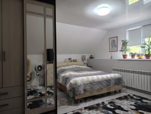 На втором этаже 2 большие комнаты, можно разделить и сделать 4 поменьше, санузел и кладовая. Дом газифицирован, электричество 15 КВатт, на случай отключения подведено питание от бензогенератора, вода- скважина , канализация - септик.