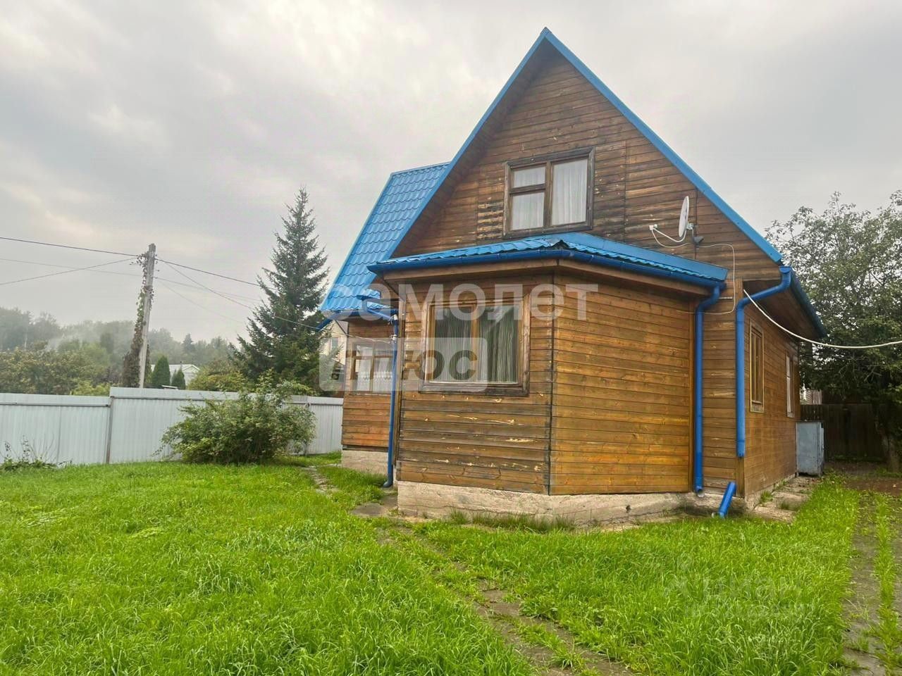 Общая площадь дома 105 кв. м; построен по каркасной технологии, фундамент ленточный, крыша мeталлочepепицa, водостоки, наружная отделка имитация бруса, внутренняя отделка натуральная евровагонка, металлическая входная дверь, оригинальная лестница по индивидуальному заказу. Стены дома, крыша и пол проложены утеплителем. Санузел совмещен, стоит душевая кабина.