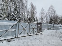 - участок по периметру огорожен забором из металлопрофиля, сделаны калитка и откатные ворота для заезда авто