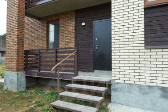 Дом возведён из блоков с отделкой фасада керамическим кирпичом.