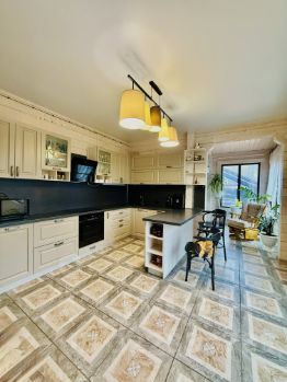 Стильный интерьер дома в спокойных тонах. На первом этаже - просторная кухня-гостиная, отдельная столовая или зимний сад с панорамными окнами, спальня 12 кв.м, санузел с душевой, прихожая и котельная. Итальянский кухонный гарнитур со встроенной дорогой техникой. Под лестницей организована зона хранения. По всему первому этажу - теплый пол.